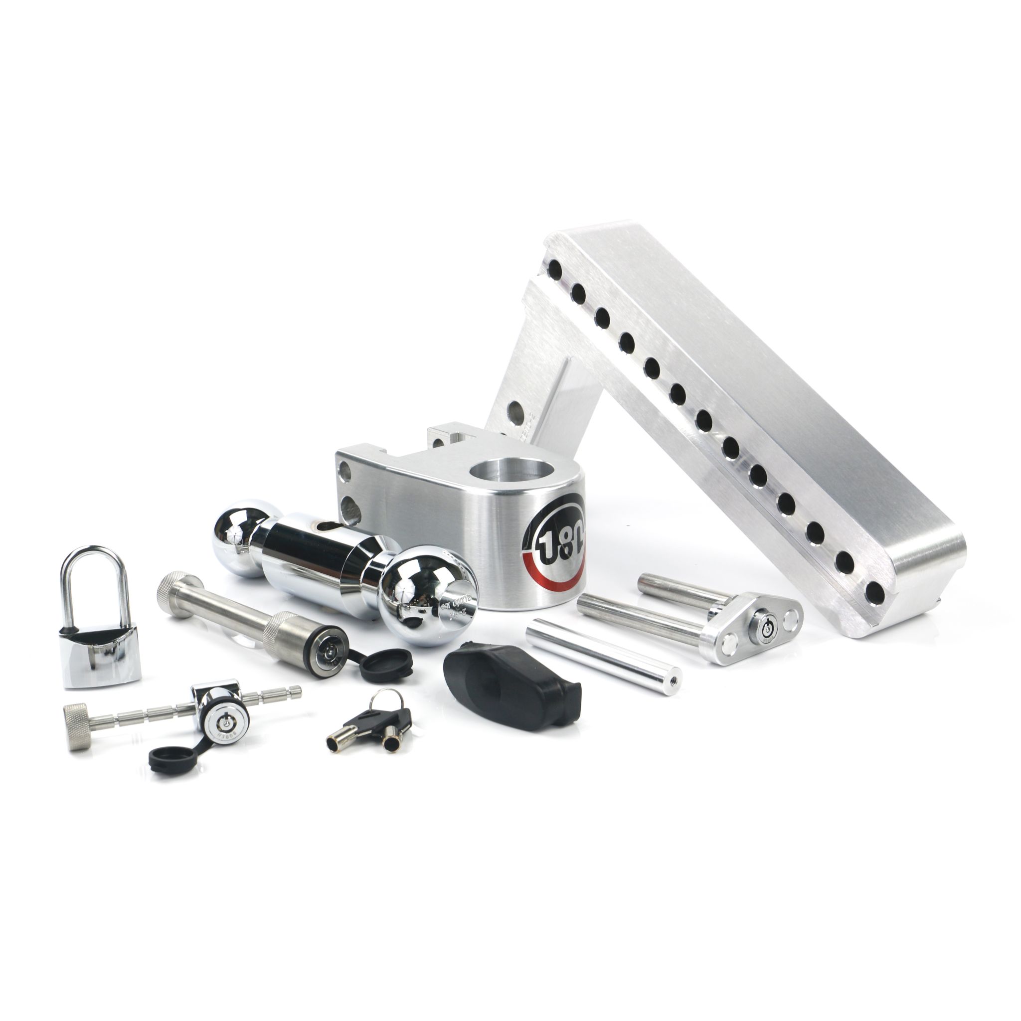 180 Hitch – Adjustable Drop Hitch w/ 10" Drop & 2" Shank + Chrome-Plated Steel Combo Ball (2" & 2 5/16") 12,500 lbs. GTW with Keyed-Alike Hitch Pin Lock, Coupler Latch Lock, & Padlock