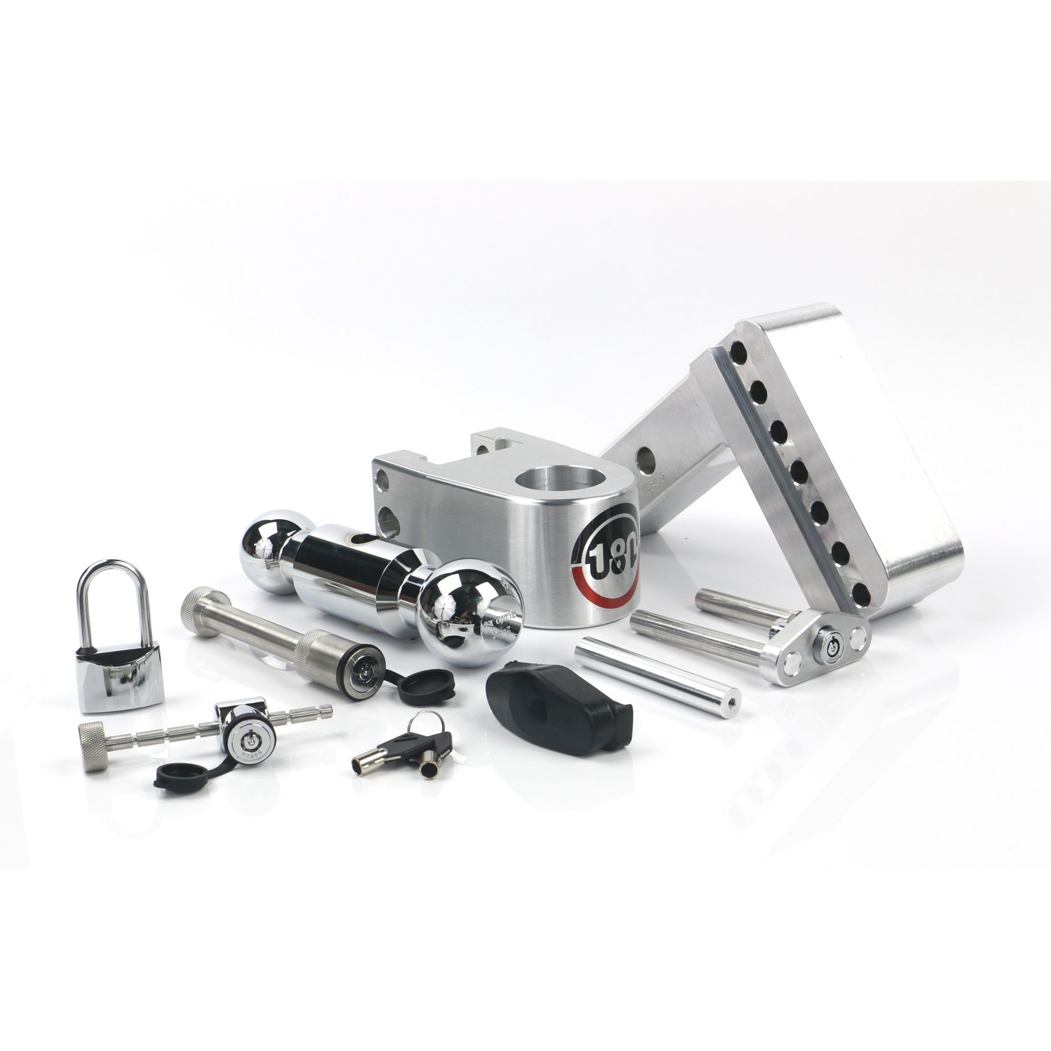 180 Hitch – Adjustable Drop Hitch w/ 4" Drop & 2" Shank + Chrome-Plated Steel Combo Ball (2" & 2 5/16") 12,500 lbs. GTW with Keyed-Alike Hitch Pin Lock, Coupler Latch Lock, & Padlock