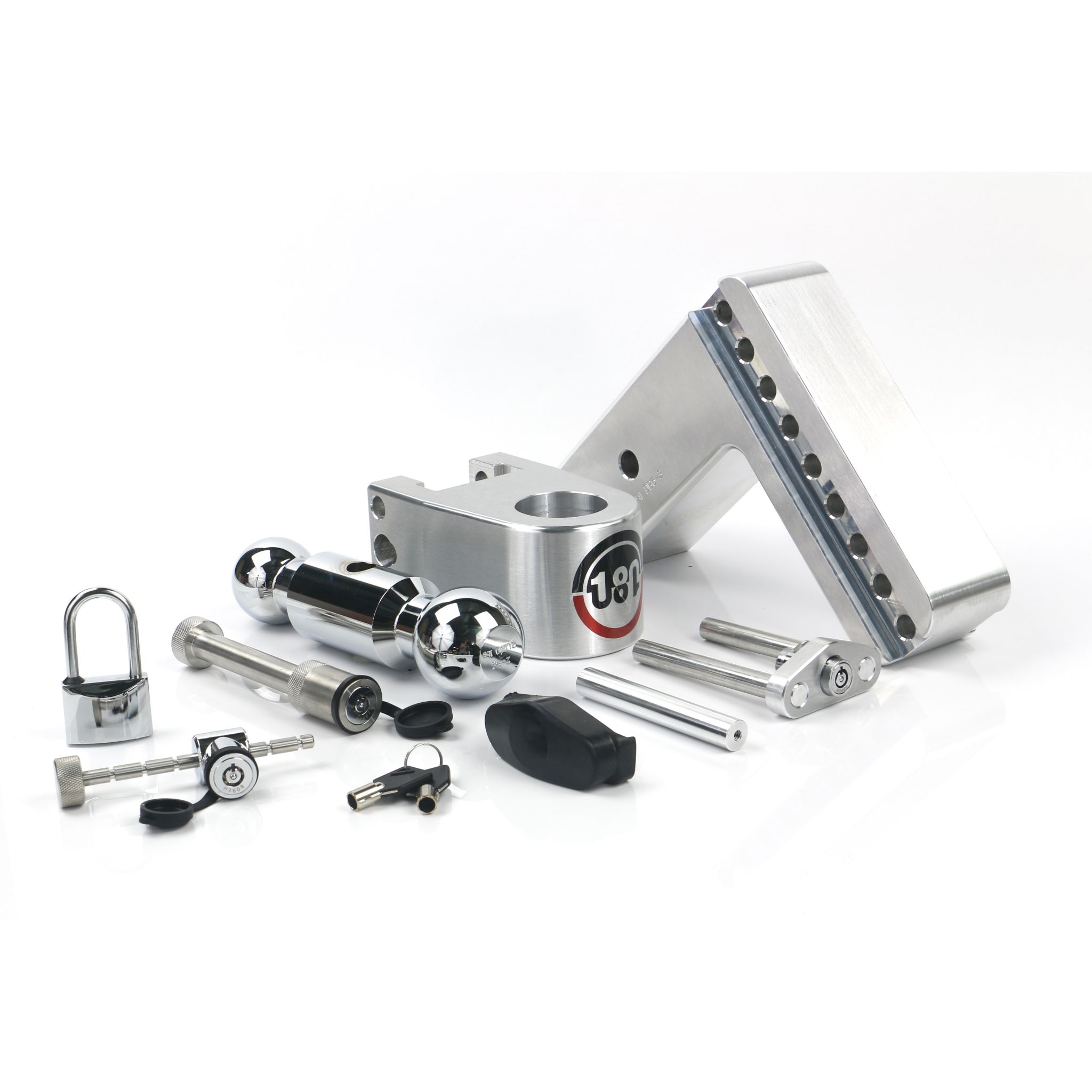 180 Hitch – Adjustable Drop Hitch w/ 6" Drop & 3" Shank + Chrome-Plated Steel Combo Ball (2" & 2 5/16") 21,000 lbs. GTW with Keyed-Alike Hitch Pin Lock, Coupler Latch Lock, & Padlock