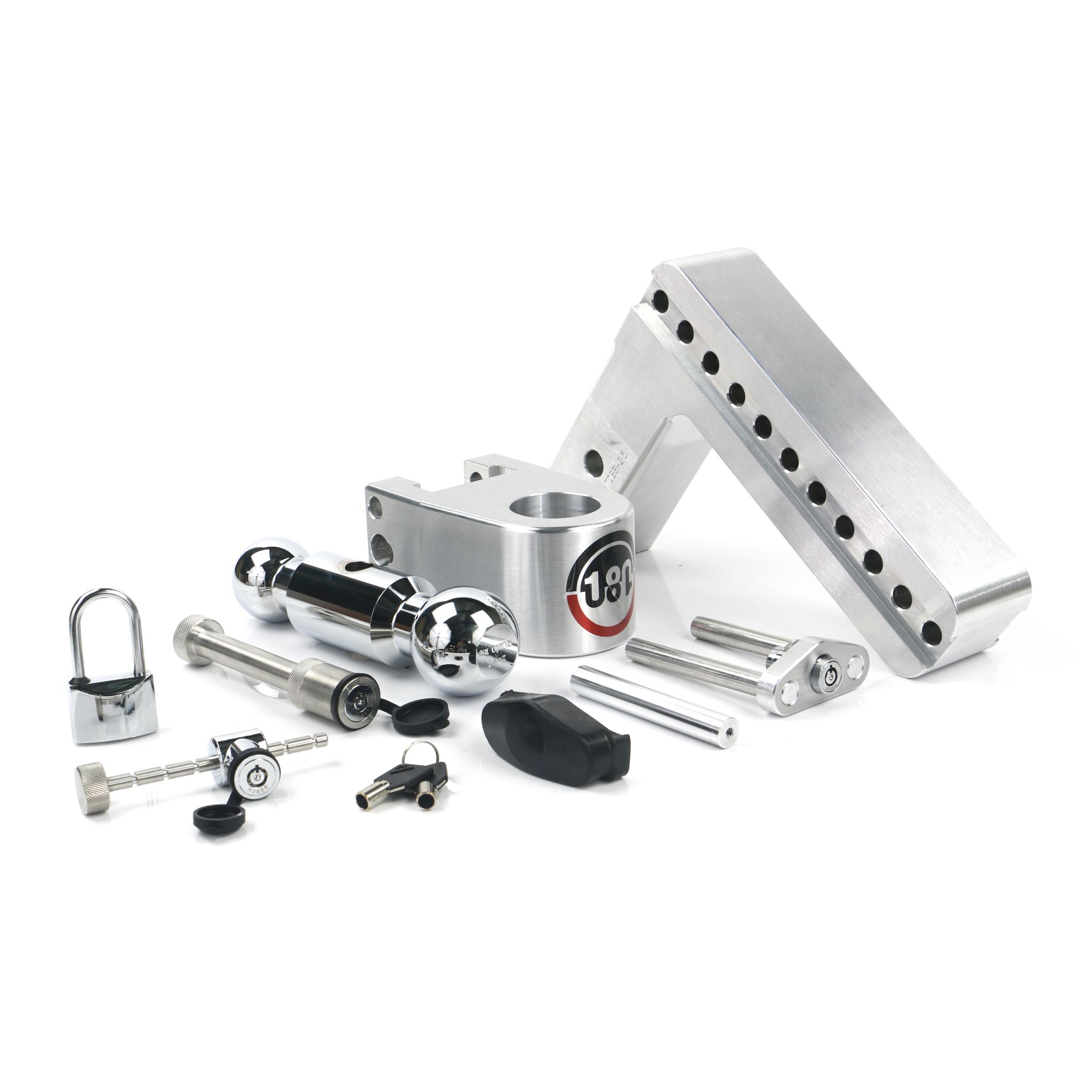 180 Hitch – Adjustable Drop Hitch w/ 8" Drop & 2.5" Shank + Chrome-Plated Steel Combo Ball (2" & 2 5/16") 18,500 lbs. GTW with Keyed-Alike Hitch Pin Lock, Coupler Latch Lock, & Padlock
