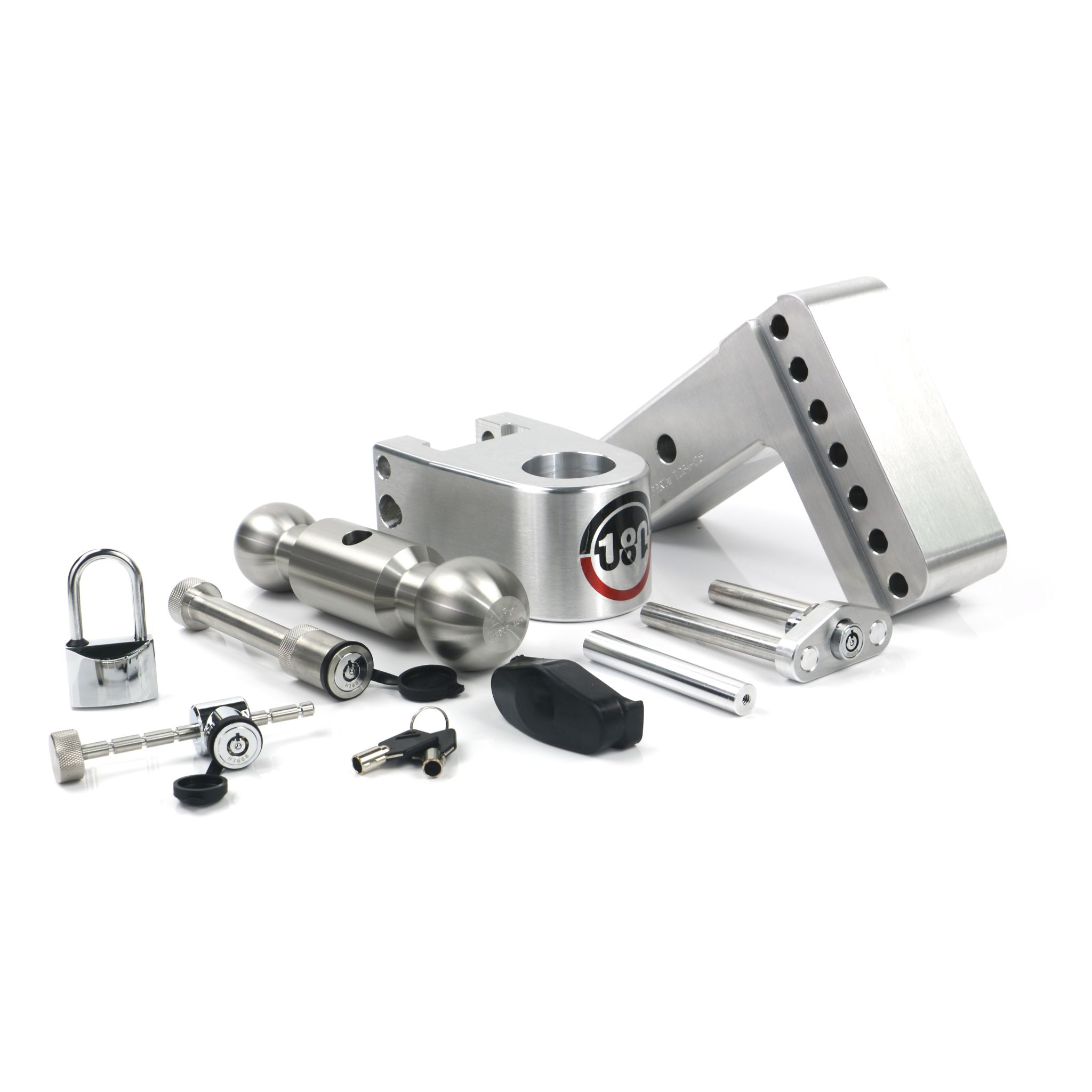 180 Hitch – Adjustable Drop Hitch w/ 4" Drop & 2.5" Shank + Stainless Steel Combo Balls (2" & 2 5/16") – 18,500 lbs GTW with Keyed-Alike Hitch Pin Lock, Coupler Latch Lock, & Padlock