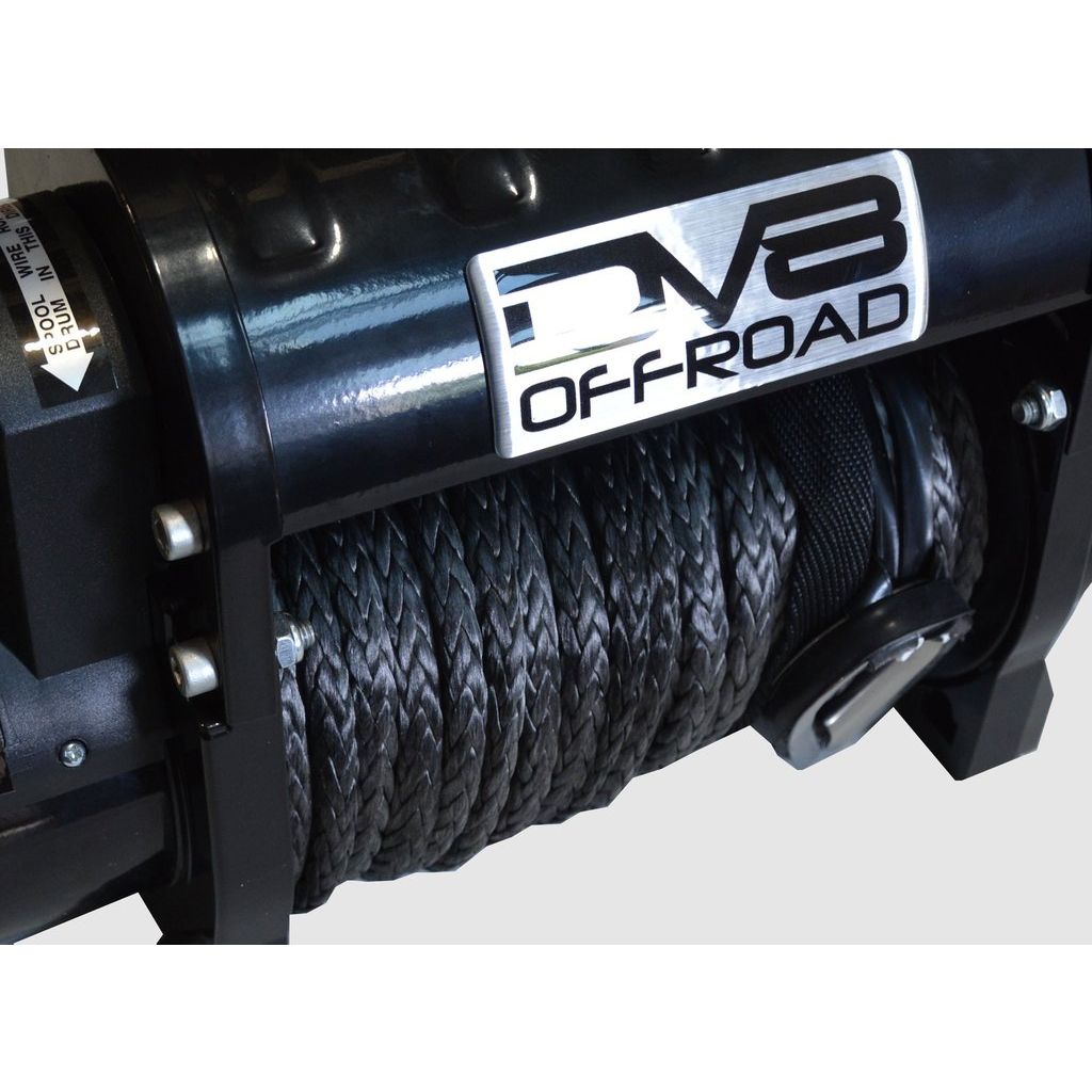 DV8 Offroad 12000 pound Winch Black w/ synthetic line. Details: 6hp motor 12DC series. Gear Train: 3 staged planetary. Gear reduction ratio 256:1. Galvanized steel hook. Metal control box. Include all wiring and hardware. 12.5 foot wired remote and Wireless remote and Hause Aluminum Fairlead.