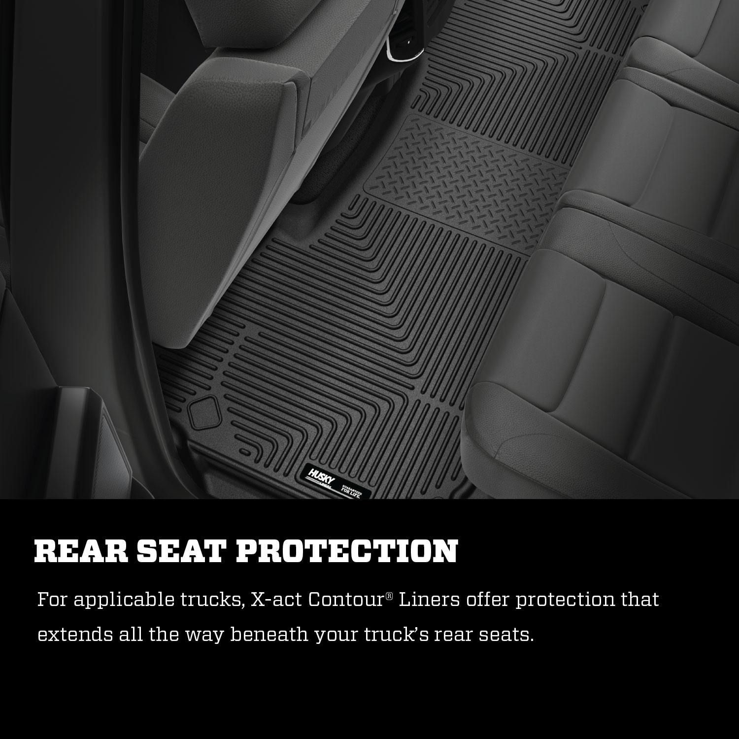 Nothing fits your vehicle better or protects longer than Husky X-act Contour?. These liners combine laser-scanned, exact fit with a no-slip, DuraGrip? surface and a softer feel. Plus, the rock-solid stability delivered by your vehicle?s factory retention posts, and our StayPut? Nibs for a no-slip, no-slide, surface with absolutely zero compromise in protection. They?re built to stand up to whatever you?re laying down? including chemicals like battery acid and oil, with our FormFit Edge? to keep whatever spills contained for easy cleanup. Available in black. Built for a lifetime of rugged abuse, warrantees the same.