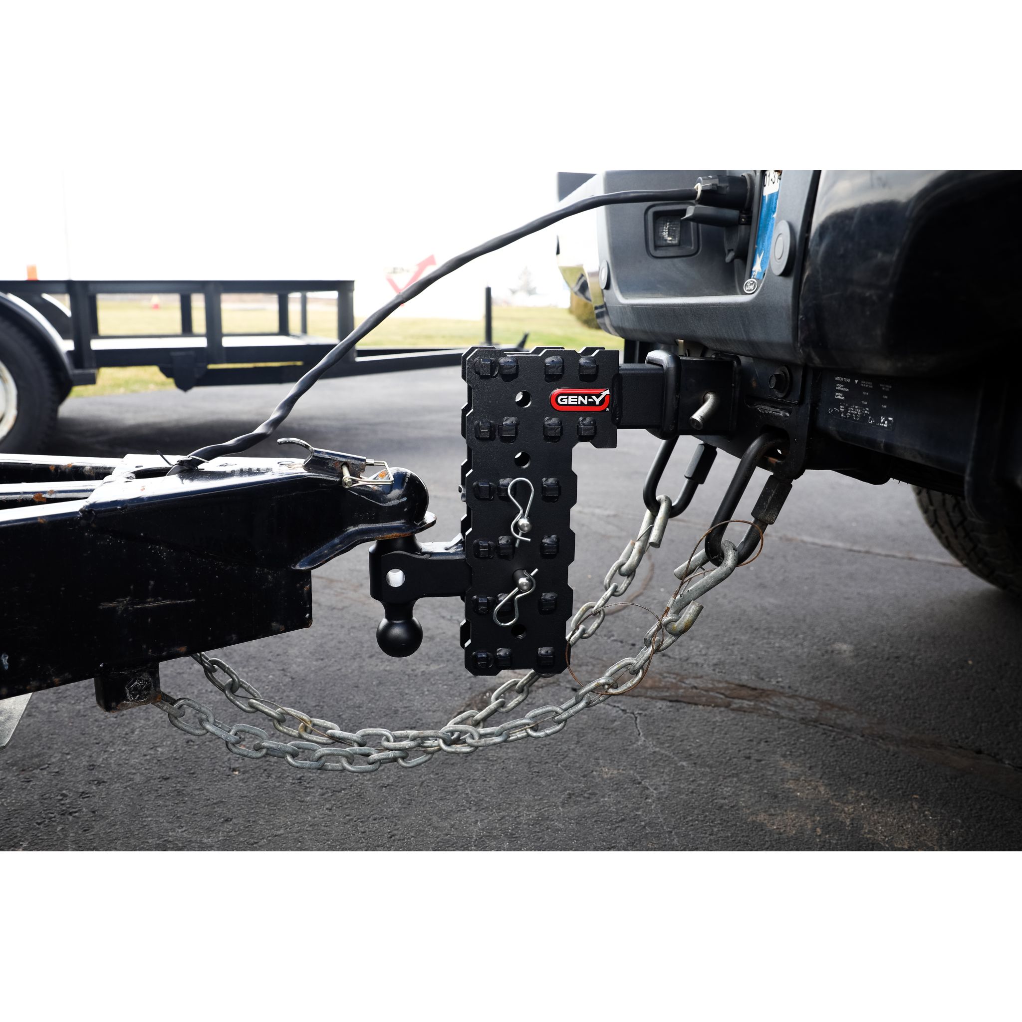 The PHANTOM-X 16K Drop Hitch is a competitively priced hitch perfect for heavy-duty towing. The PHANTOM-X Hitch is compatible with 2.5" truck receivers and is available with a dual-ball mount or a tri-ball mount. It is also offered with a pintle lock, allowing users the ability to tow with a lunette ring trailer. GEN-Y's innovative stacked tube design allows customers the ability to adjust the ball mount up or down in order to achieve the right amount of drop every time!